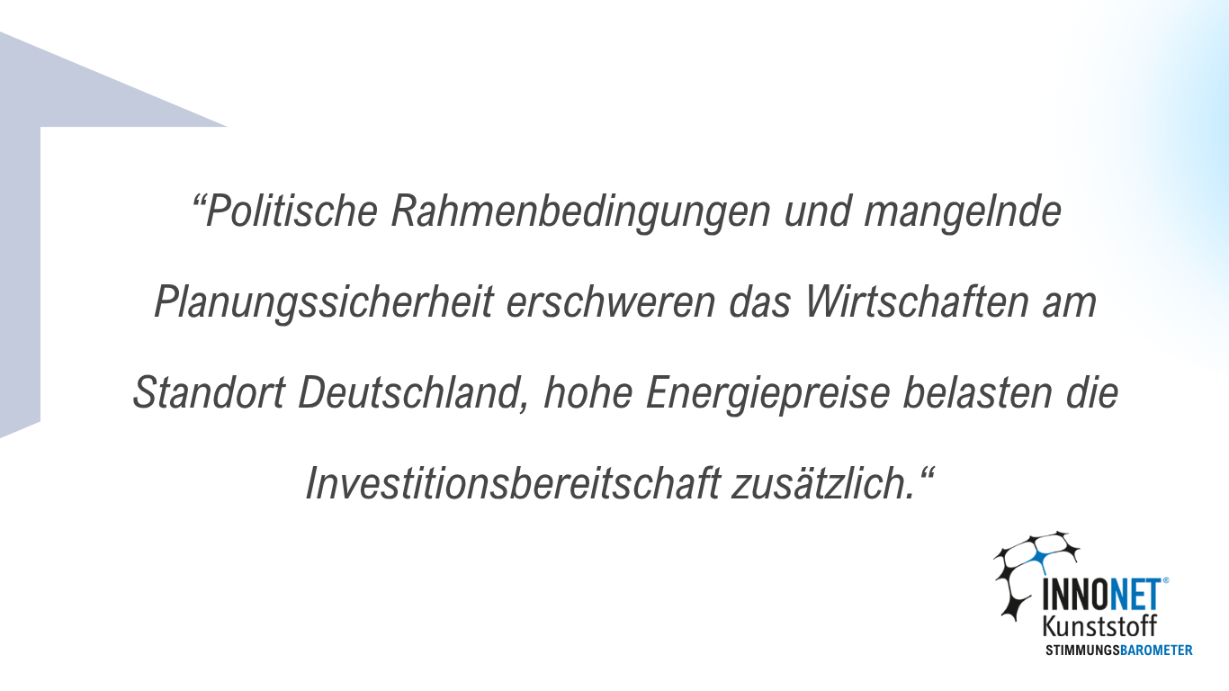 Das INNONET-Stimmungsbarometer ist eine zweimal jährlich durchgeführte quantitative Erhebung. Wir nutzen diese Gelegenheit, um neben den persönlichen Gesprächen auch Zahlen und Fakten zu sammeln. Unser Ziel ist es, Ihnen Informationen und Transparenz über die aktuelle Lage und den Ausblick in der süddeutschen Kunststoffbranche bereitzustellen.